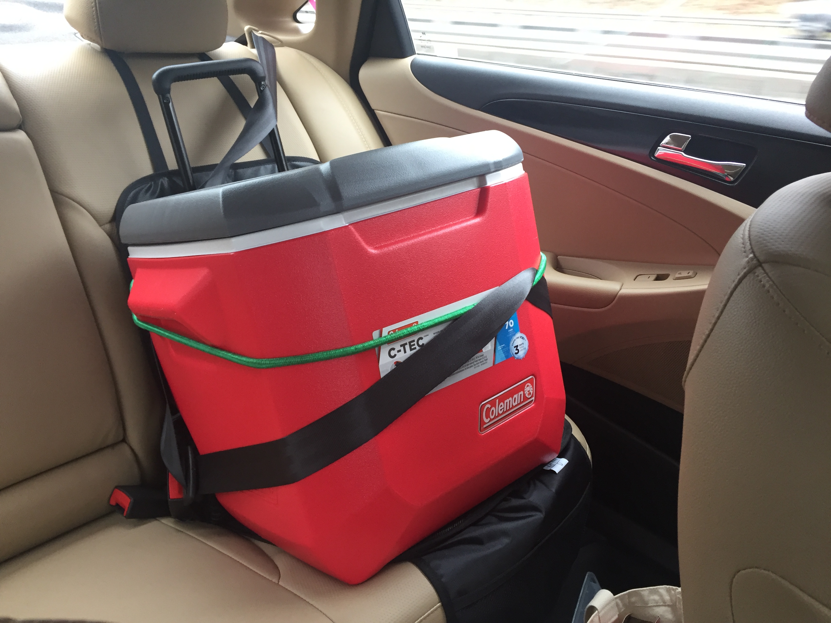 imageAnd the last thing we got for this trip and we loved, was the new Coleman cooler we bought for the back seat. It was just the right size (45 quart) for all that we wanted to keep cold, had a drain in the back (and not a lot of coolers seem to have one these days), and wheels that made it easy to roll into our motel rooms. The one problem is that the telescoping handle (kind of like a rolling suitcase) does not lock into position, so if you are pulling it the handle is fine, but if you try to push it, the handle un-telescopes. It needs to lock into position, and we’ll be imageworking on a solution to that issue down the road. We ordered a seat cover that is designed to go under a kid’s car seat, so the back seat was kept clean, and we strapped it in each morning with the seat belt and a bungie cord, and it was super stable. The cooler made it easy for us to do one of our favorite things, and that is have lunch along the way. Some days it was at a picnic table at a rest stop (once we were in warmer states), and other days it was in the front seat of our car, but either way we like this a lot better than buying lunch. Something that I guess we both did when we were on trips with our parents, something we did for the first time on our honeymoon, and definitely something we did with our three kids when they were growing up, and we were on the road.
