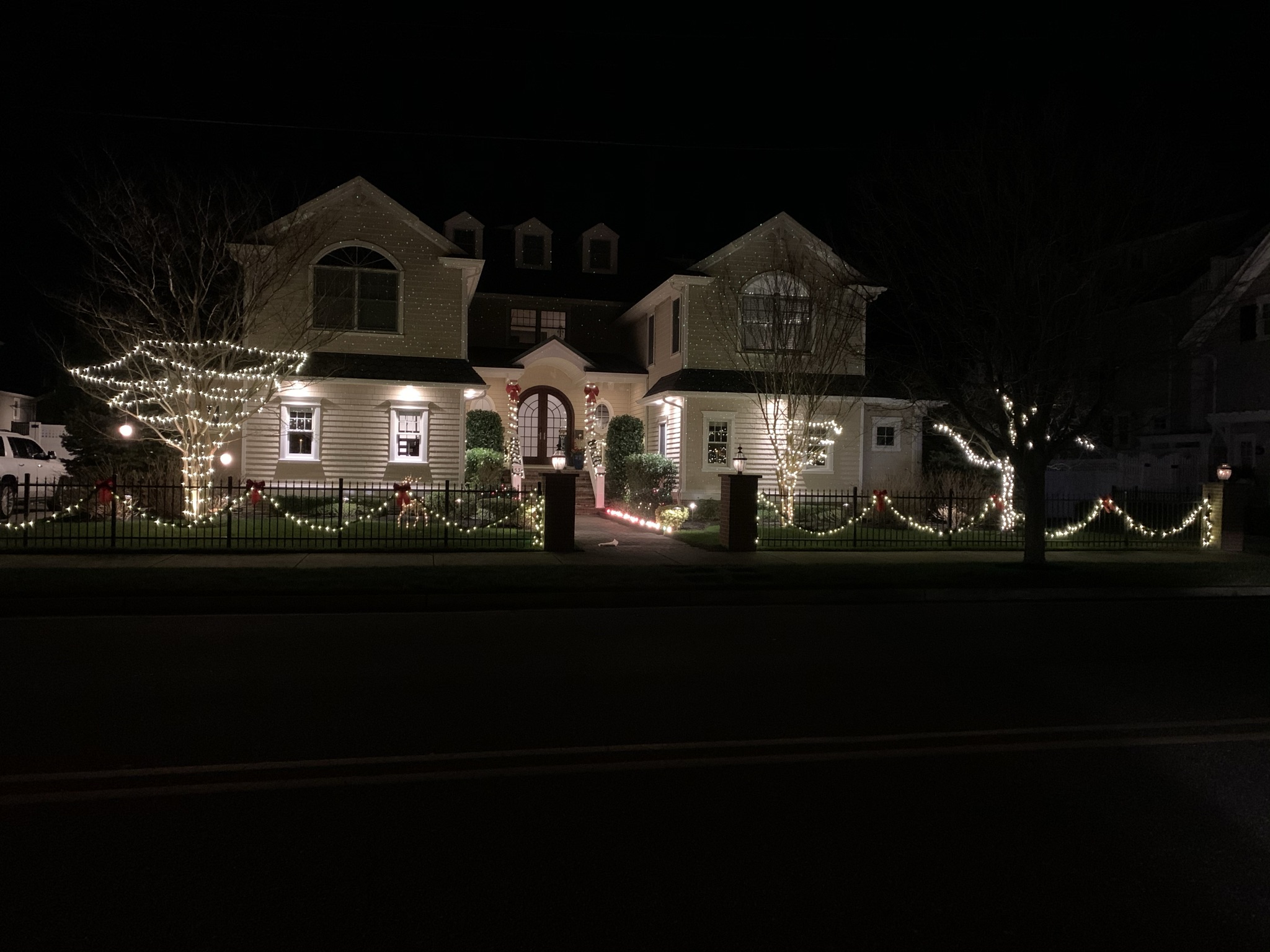 As the kids got older, and tastes changed, we went from colored lights to all white lights out front, and the fireplace, tree, Santa and the Manger scene morphed into garland and wreaths and lighting up the fence around the house. Things were added and we refined the look as the years went on, and honestly, as we got older and the kids no longer lived with us, we went for ease of decorating too! The last year we decorated the Mineola house was Christmas 2016, before we sold the house after 31 years. Here’s a look at that!
