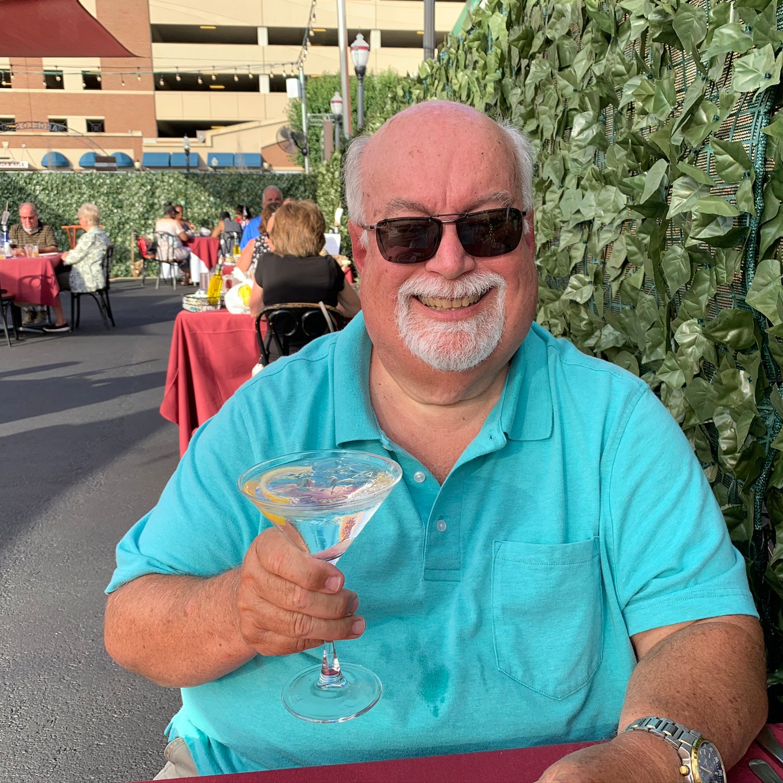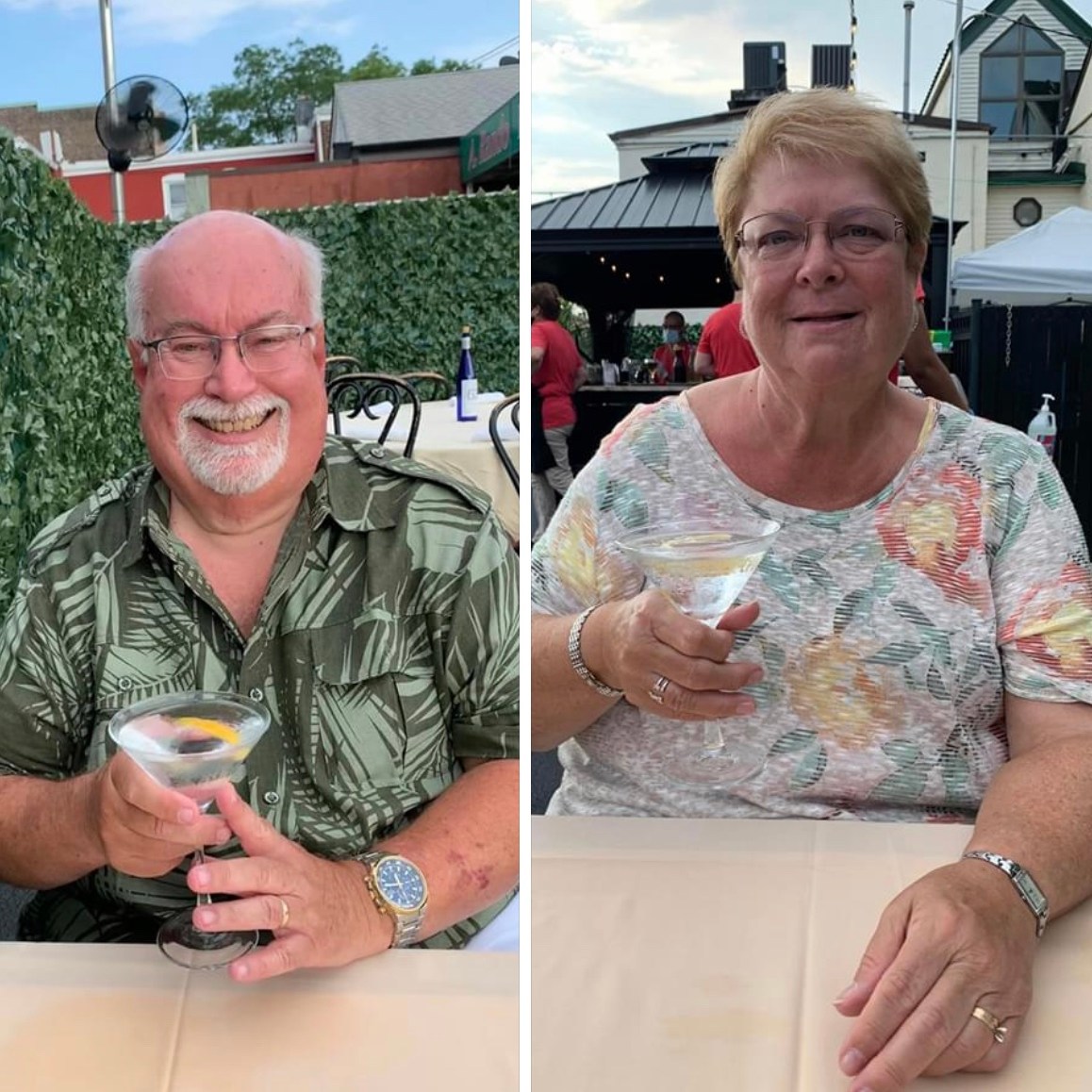 Angelo’s converted their parking lot to outdoor dining. They had an extensive waiting area, a beautiful outdoor bar, a free-standing bathroom, and a very nice “dining room”, not under a tent, but covered by colorful sails! All our regular Thursday friends were back, and it was great to be back in the fold! We missed sitting at the bar with our friend Michael, but many times, Michael was our waiter. At other times it was our friends Theresa, or Rhonda, or Patty who’d serve us a couple of Grey Goose Martinis and a selection of the food we loved!!