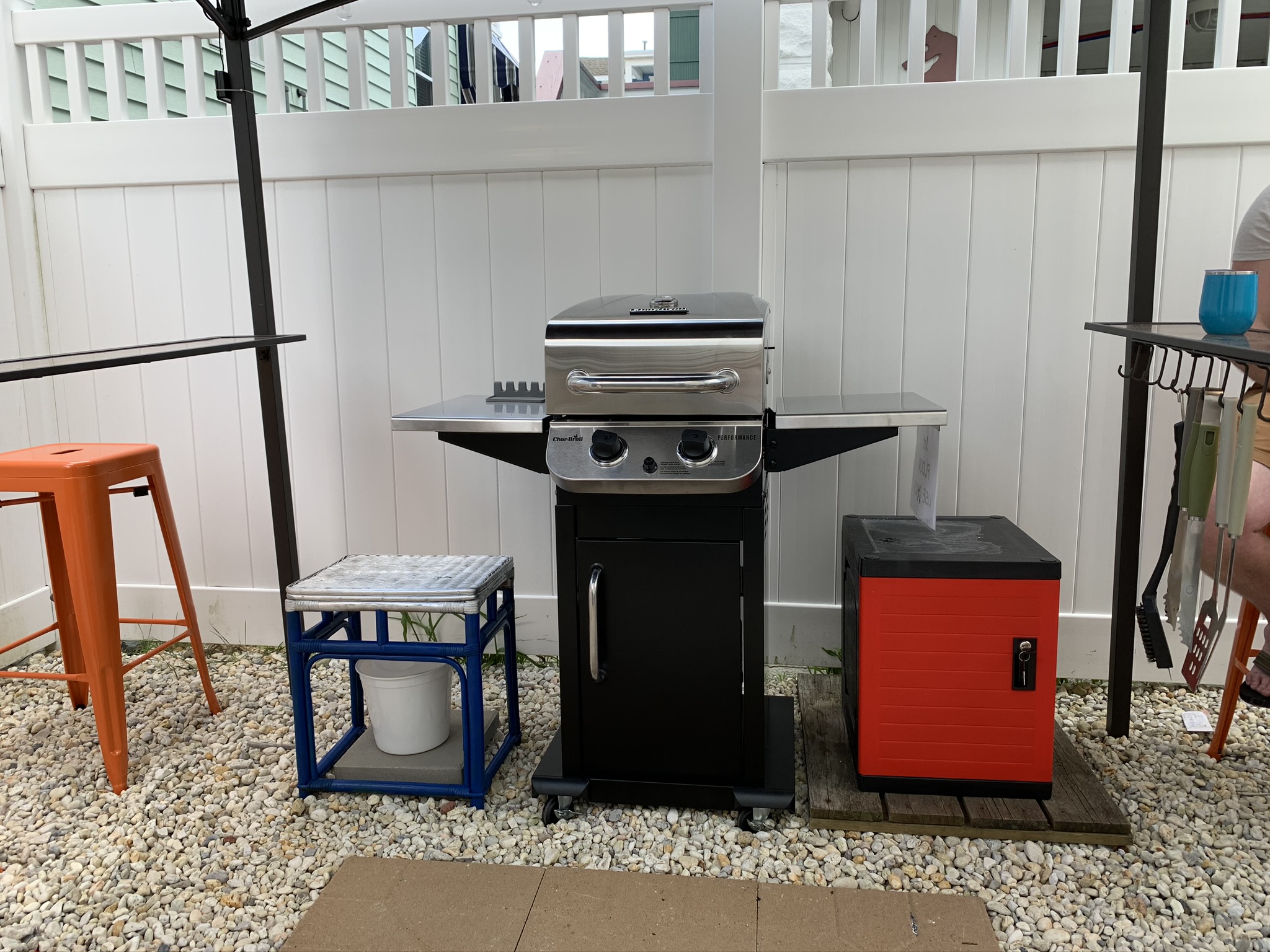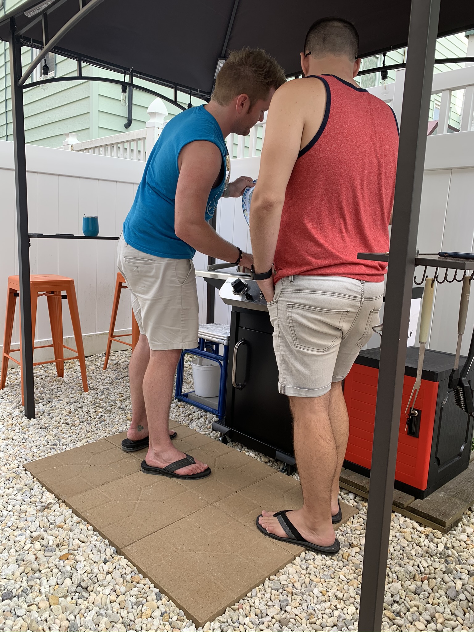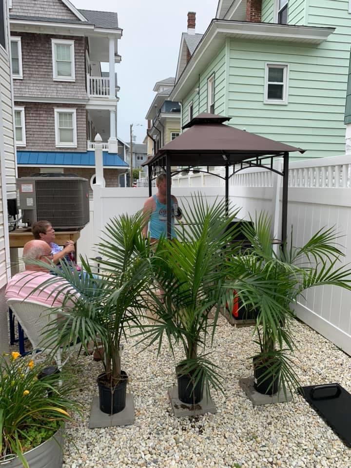 Let’s just admit something here…”Our Boys” (Kenny and Chris) were bored! Sitting on the beach or sitting on the front porch reading was not their cup of tea! They did exercises, walked the beach and neighborhood, but really needed a project! One day, Chris came in and told us that Doc got a new backyard grill and that he’d said that Chris could take his old one. Suddenly we had a grill and the boys had a project! The Oasis was born!