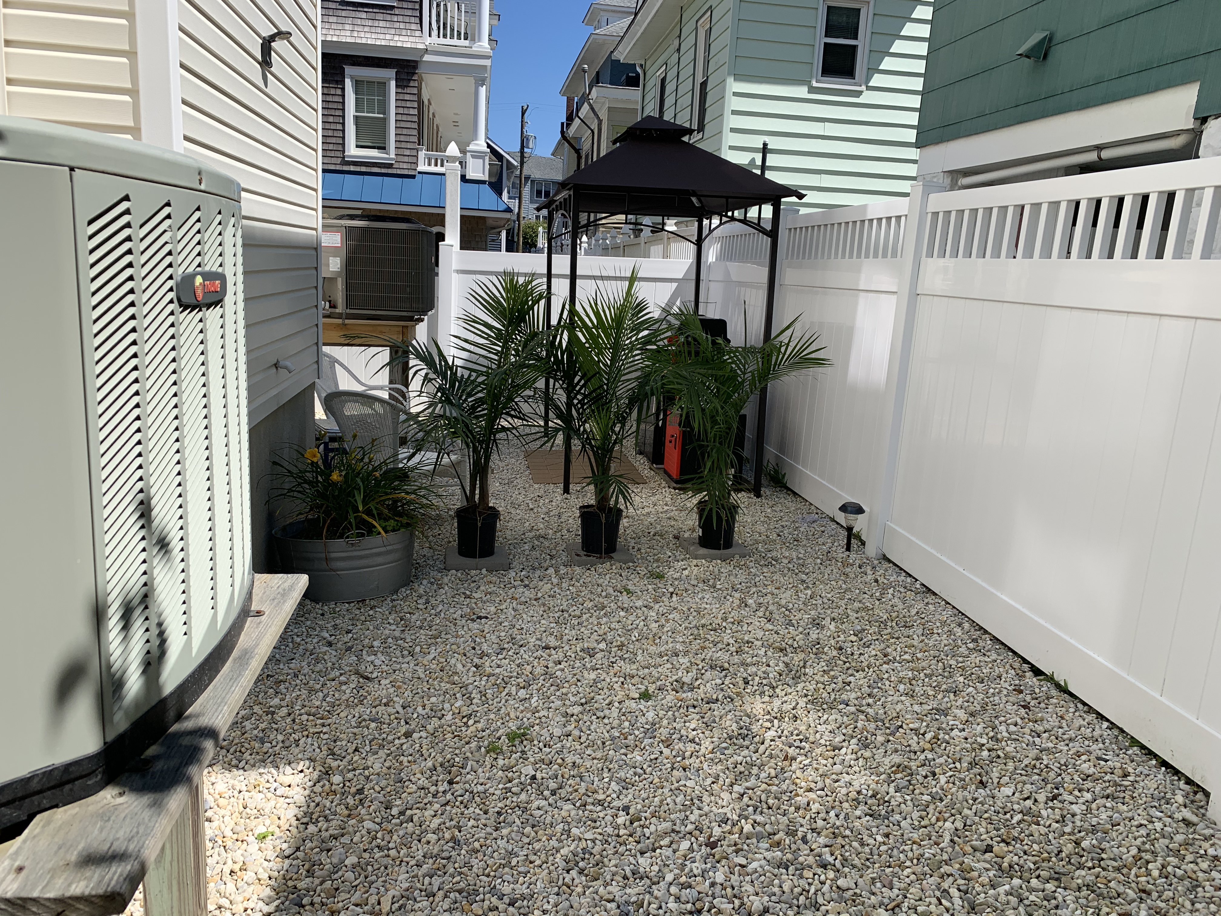 As we share a backyard with our co-owners, the first task was creating a private area on our side and easing access to the back yard. We headed over to Lowes and purchased pavers to make a walkway to the back, and some palm trees for a little privacy. The boys now had a project! Neighbors across the street were throwing out some old small wicker tables, and Chris had another project…repaint them! Then Susie saw a gazebo structure online at Lowes, and we went back and purchased that. Another project…build the gazebo! The Oasis was well on the way! Then a set back…suddenly one day, as steaks were grilling, flames came out of the firebox and started the control panel on fire! Oh Boy!! The fire was put out, Doc’s old grill went to the curb, and we went back to Lowes and purchased a brand new grill. Stools were ordered, lights were strung, and the Oasis was in great shape! The boys had enjoyed the project, and we had a new backyard feature!