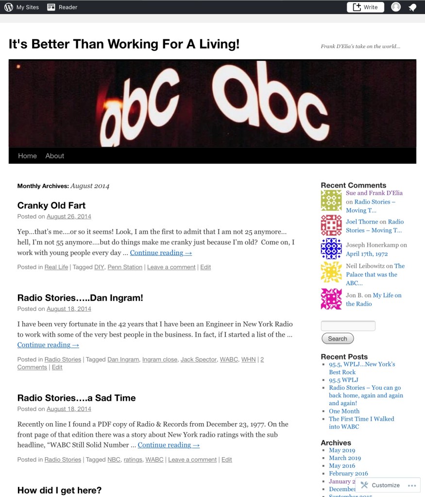 Early in January, 2016, I put in my retirement papers at WABC, with the intention of my last day of employment being January 29th, and in that last month at WABC, I wrote and posted 11 blogs about my years at the station. After January, as I moved on to a new life of retirement, the posts dwindled, and although the blog is still “active”, the last post went up in May of 2019, and the reality is that it was just a link to a post in this blog!