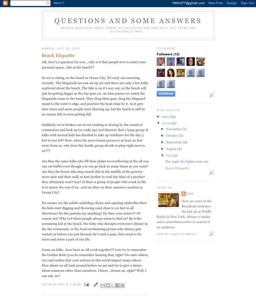 My first blog, that started back on July 26th, 2010 and was called “Questions and Some Answers” (http://fd3qa.blogspot.com/2010/07/) . In the About Me description, I wrote, “Always a reader and a sometimes writer in search of an audience.”